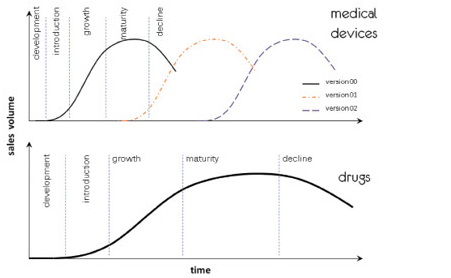 Στο σχήμα 2 φαίνεται ο συγκριτικός τυπικός κύκλος ζωής των ιατρικών συσκευών και των φαρμακευτικών προϊόντων. Σε σύγκριση με τον κύκλο ζωής των φαρμακευτικών προϊόντων, οι ιατρικές συσκευές έχουν ταχύτερους χρόνους κύκλου λόγω των σταδιακών αναβαθμίσεων, οι οποίες παρέχουν βασικές πληροφορίες και αποδεικτικά στοιχεία για περαιτέρω βελτιώσεις των συσκευών.