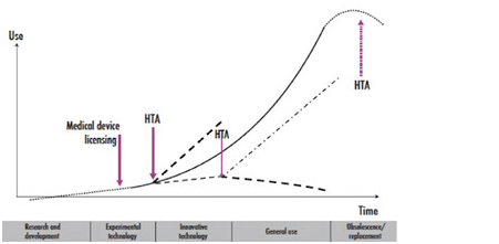 Ο Παγκόσμιος Οργανισμός Υγείας (ΠΟΥ) παρουσιάζει τον κύκλο ζωής μιας τεχνολογίας υγείας και τις διαφορετικές προσεγγίσεις της HTA στον κύκλο ζωής του προϊόντος (σχήμα 1). Η πρόθεση της HTA είναι να βελτιώσει την υιοθέτηση νέων οικονομικά αποδοτικών τεχνολογιών, να αποφύγει την υιοθέτηση τεχνολογιών που μπορούν να βλάψουν τον άνθρωπο ή είναι αμφίβολης αξίας για τα συστήματα υγείας, και να επιβραδύνει την υιοθέτηση τεχνολογιών που φαίνονται πολλά υποσχόμενες, αλλά επί του παρόντος έχουν αβεβαιότητες.
